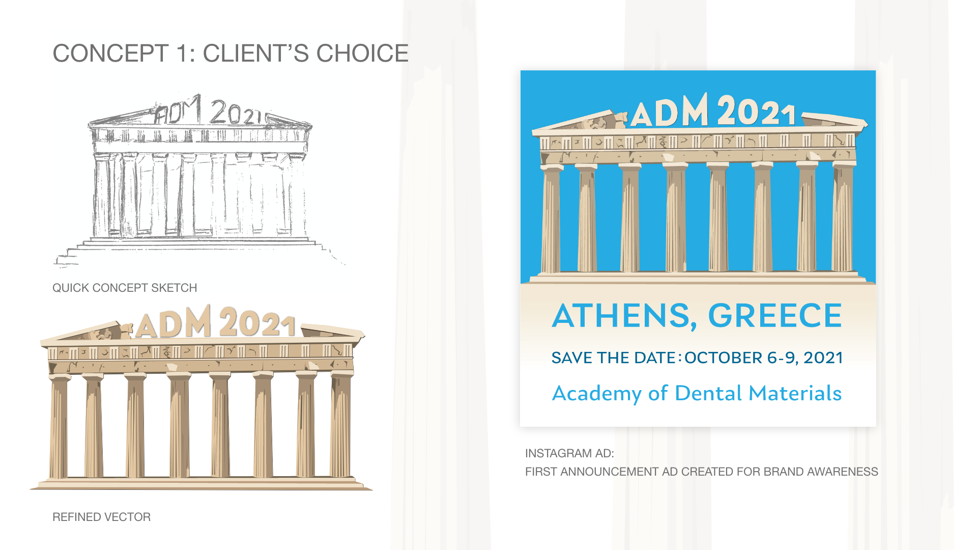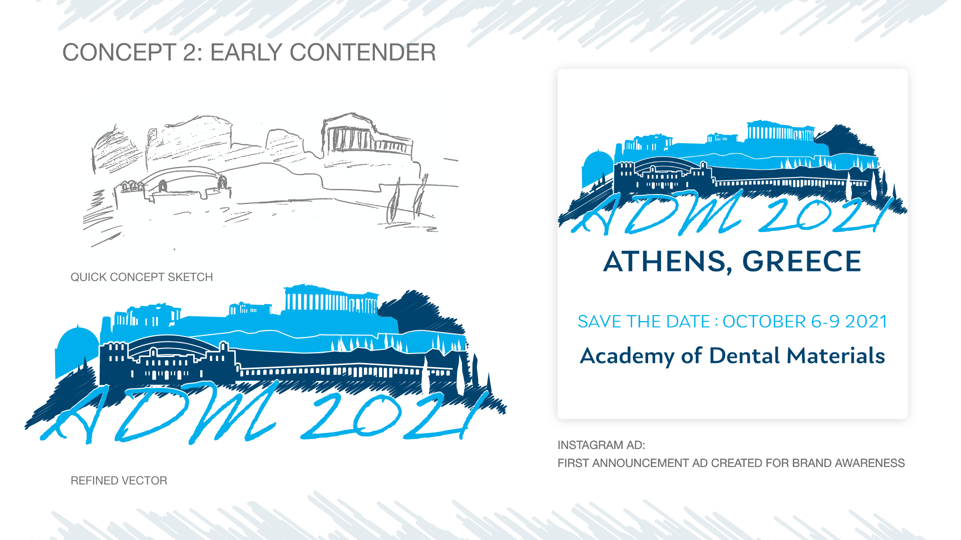 The above images show the workflow and iterative process for creating the conference brand for the upcoming 2021 ADM International Conference. The ADM (Academy of Dental Materials) is a client of RES Seminars. As their Web and Graphic Design Specialist, I am responsible for brand development for the conference.